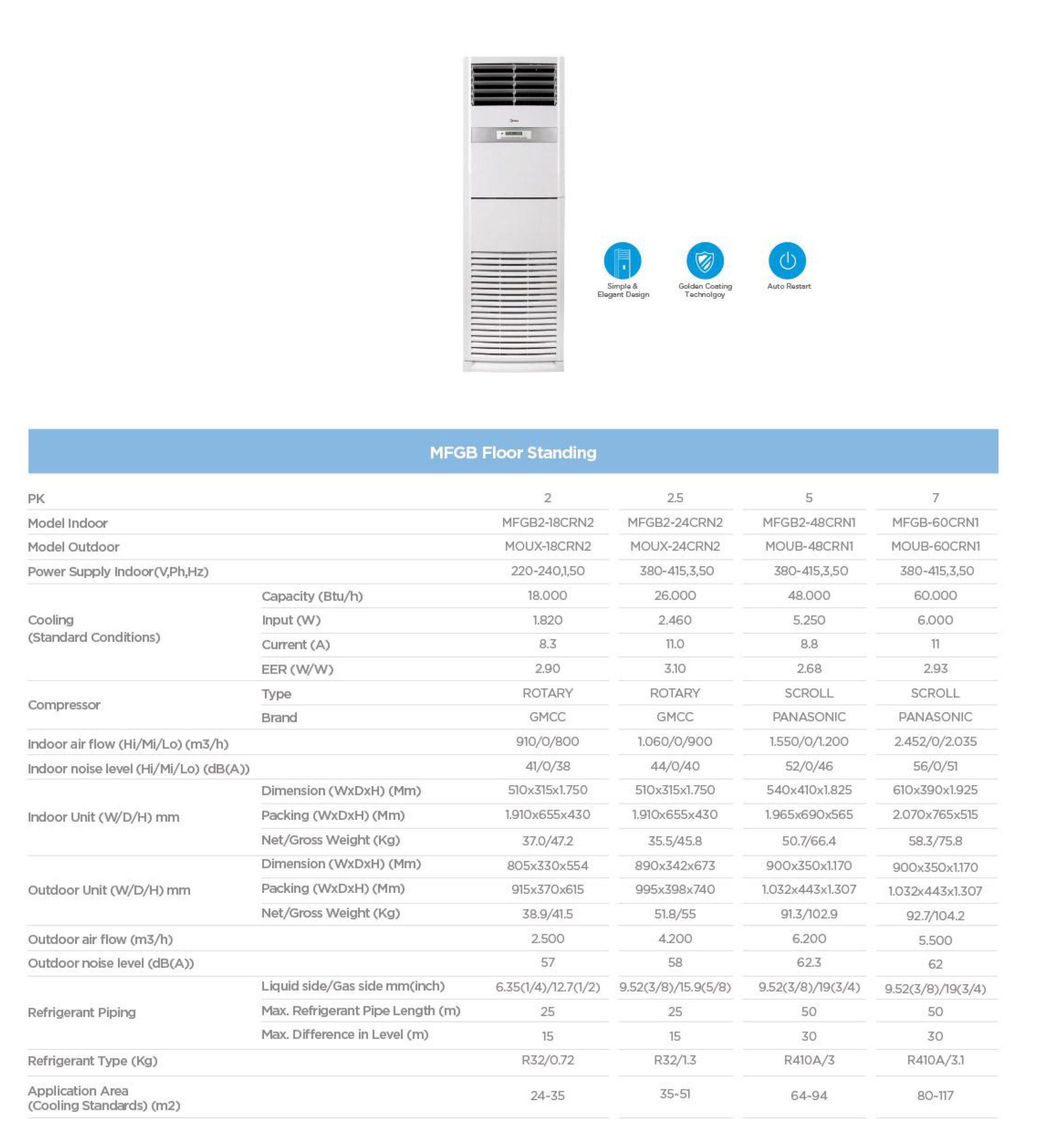 Midea MFG82-18CRN2 dirancang untuk operasional yang stabil dan tahan lama, menjadikannya pilihan tepat untuk penggunaan komersial harian. Desain unit yang berdiri di lantai juga memberikan fleksibilitas instalasi tanpa perlu pekerjaan plafon atau modifikasi besar pada bangunan.
