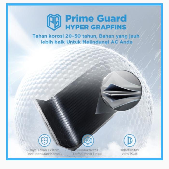 - Teknologi Hyper Graphfins meningkatkan performa pendinginan, sementara sistem 3 Layer High Density Filter terdiri dari filter mekanis yang menyaring partikel debu halus serta filter katalis dingin yang mengurai gas berbahaya di udara.