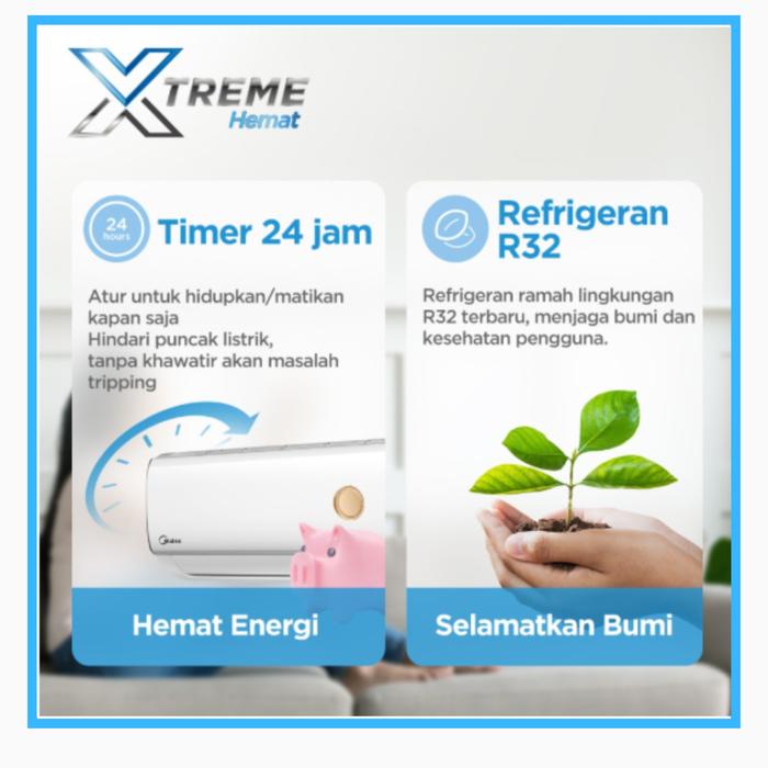 - AC 1 pk Midea standar MSAF-09CRN Xtreme Dura dilengkapi dengan refrigeran R32 generasi terbaru yang menawarkan pendinginan cepat dan efisiensi tinggi.
